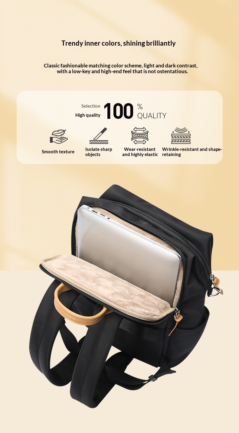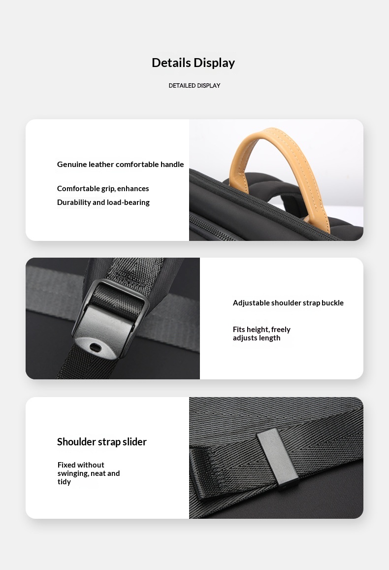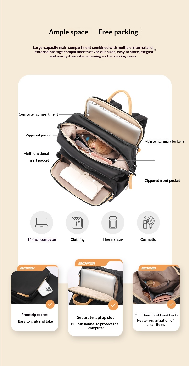 Internal structure of the bag: Phone pocket, document pocket, zippered compartment, laptop slot